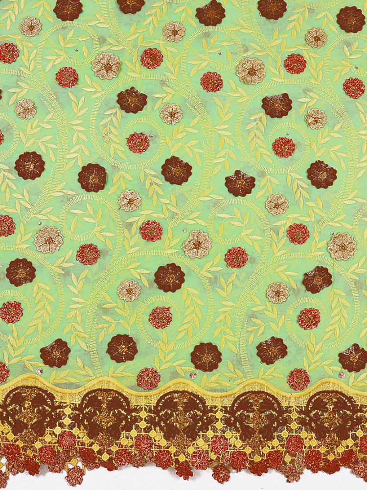 There are more than 400 sparkling stones per yard of this wonderful voile fabric. Sold in 5 yard strips, that’s more than 2000 per order! The embroidery is flawless, and being a voile lace, there’s a delicateness to this fabric that’s simply stunning. There are many different colour options to choose from, including cream & army green, royal & white, yellow, mint & orange, and white & aqua. The blues and creams are quite understated and mellow, whereas the orange and royal options are more dramatic and bold - this voile lace is very versatile.